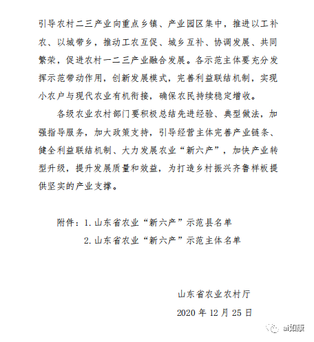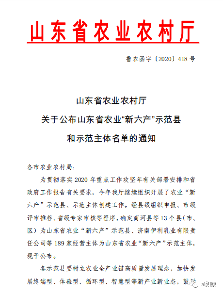 近日,山东省农业农村厅印发《关于公布山东省农业“新六产”示范县、示范主体名单的通知》,经各市推荐、专家评审,省农业农村厅拟确定山东省农业“新六产”示范县13个、示范主体189家名单。388太阳集团榜上有名,成功入选山东省农业“新六产”示范主体。标志着388太阳集团在推动新旧动能转换,促进一二三产业融合方面获得高度认可。